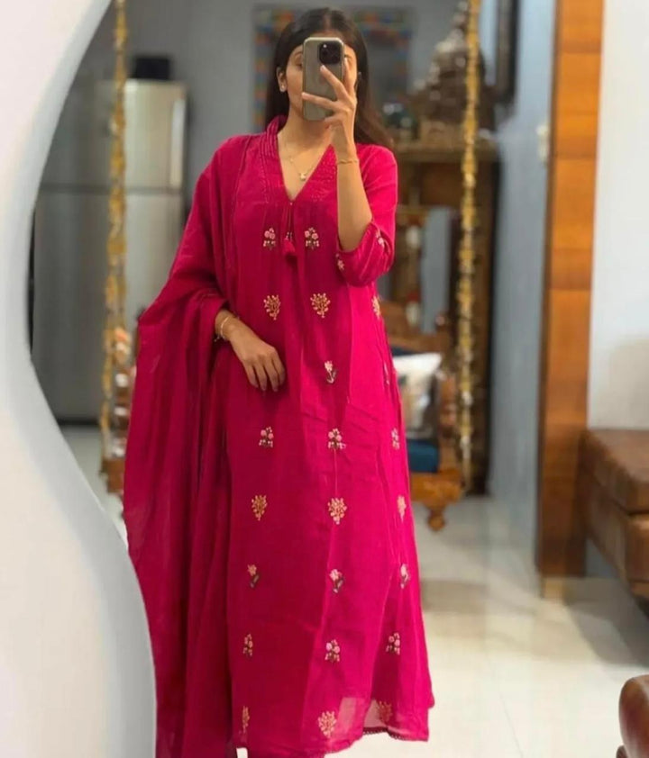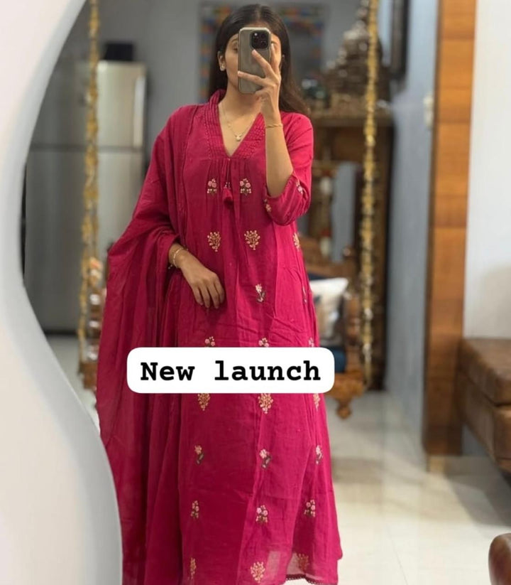 Pure Cotton Pleated Kurta Pant Dupatta Set | Heavy All-Over Embroidery | 3-Piece Suit